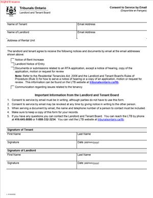A Consent to Service by Email is a simple, one-page form that gives written permission for case-related documents to be delivered to you by email instead of by mail, courier, or hand delivery. By signing it, you authorize the tribunal that decides residential tenancy disputes in Ontario, and the other parties in your case, to serve documents to the email address you specify. It is optional, but once you provide consent, your email address becomes your address for service for the documents covered by the form.