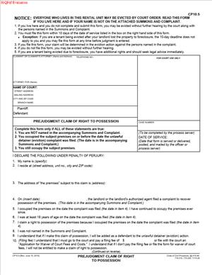 You use a CP10.5 when an eviction lawsuit is underway, you are in possession of the property, and you are not named as a defendant in the complaint. You will know this is the situation when you see your address on the complaint, but your name is not on the list of defendants. The packet you receive will include a Summons, a Complaint—Unlawful Detainer, a “Notice to Occupants,” and a Prejudgment Claim of Right to Possession form. You might receive it by posting on your door and mailing, or by personal delivery.