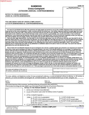 - A cross-complaint is a lawsuit filed by a defendant against someone else in the same case. On this form, it means you are the cross-complainant starting a claim against one or more cross-defendants. The SUM-110 summons formally notifies those cross-defendants that a cross-complaint now exists.