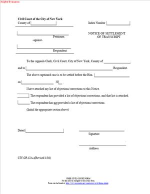 The CIV-GP-42A is a New York City Civil Court form. You use it to notify other parties that you will ask the court to “settle” a transcript. “Settle” means the judge will confirm the transcript is accurate. The judge will also resolve any disputes about what the record says.