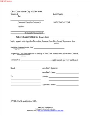 Other Names: Appeal form (Civil Court)Civil Court Notice of Appeal (NYC)Notice of Appeal (Civil Court of the City of New York)Notice of Appeal to the Appellate Term (from Civil Court)NYC Civil Court Appeal Notice