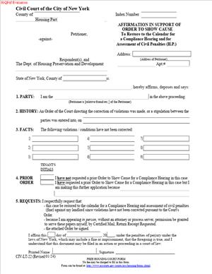 - Go to the Housing Court clerk in the county. Ask the clerk where to submit an Order to Show Cause. A motion fee may apply. Ask the clerk about any fee waiver, if needed. File early in the day to allow review.