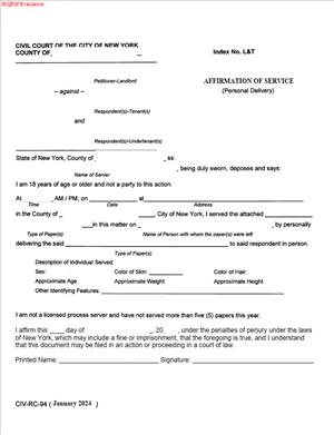 The CIV-RC-94 is a New York City Housing Court form. It is a sworn statement from the person who hand-delivered court papers. It proves when, where, how, and to whom the papers were delivered. The court uses it to confirm that the other side received the papers by personal delivery.