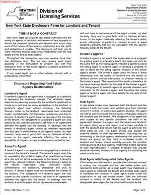 The New York State Disclosure Form for Landlord and Tenant is an agency disclosure form. It explains who a real estate licensee represents in a rental transaction. It tells you if the agent works for the landlord, the tenant, or both. It also explains the agent’s legal duties to each side. It is not a lease. It does not set rent or other deal terms. It is a notice and acknowledgment of agency relationships in a rental.