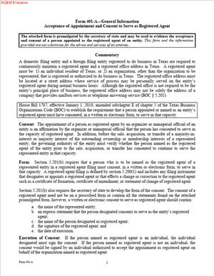 Consider a foreign entity that wants to do business in Texas. You must appoint a Texas registered agent and registered office. Your chosen agent should sign a 401-A. You use that consent to satisfy the consent requirement.